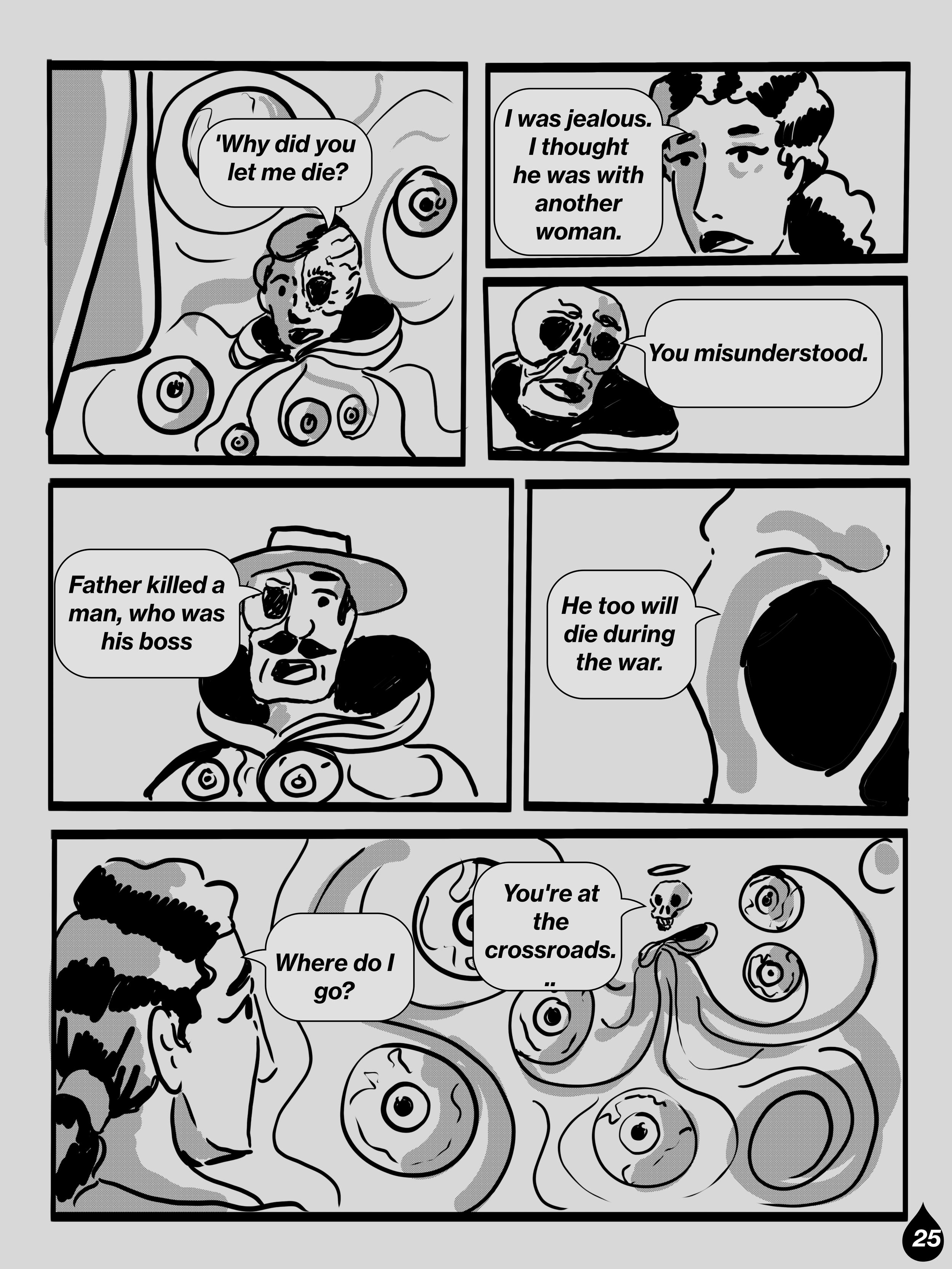 This short webcomic delves in depth into the narrative of the Mexican Revolution's political turmoil, where workers and peasants begin to rebel against the federal government, ushering in an era of instability. Through these pages, we will be viewing the story of La Llorona in a digital format. The reader will be taken into an uncomfortable setting about a sense of miscommunication between the wife and husband, and how the motives of these individuals will shape their own understanding